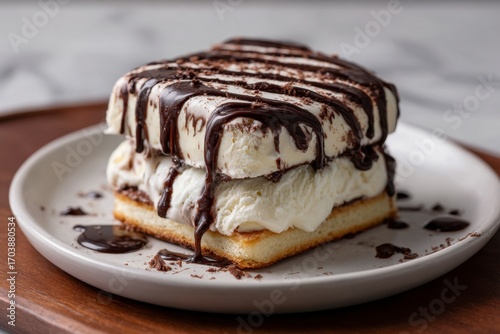 dessert, ice cream, sandwich, chocolate, plate, sauce, vanilla, treat, sweet, delicious, food, drizzle, topping, snack, indulgence, creamy, glacé, cold, confection, baked, square, epicure, culinary, photo, white, brown, texture, presentation, garnish, shaving, cocoa, layer, cake, pastry, eatery, cafes, cookery, bakery, homemade, studio, wooden, table, closeup, tasty, delectable