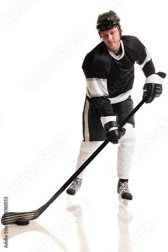 person, one person, adult, 30s, young adult, man, male, photogenic, attractive, caucasian, white, on white, studio, studio shot, sport, sport, hockey, ice hockey, athlete, athletic, hockey stick, player