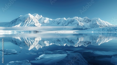 Ice melting from a glacier into a crystal-clear lake, with reflections of snow-capped mountains, capturing the delicate balance and beauty of nature. Illustration, Minimalism,