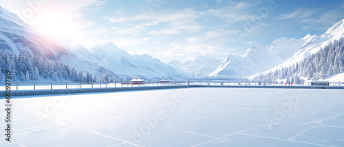 Ice Rink Background on luxury mountain resort. Ice skating. Scenery hotels of Alps on snowy winter landscape. Vacation, travelling concept. Copy space. Stadium. Panoramic view. Generative ai