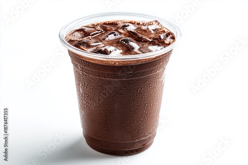 Iced chocolate drink served in a clear plastic cup with visible ice and rich cocoa texture. Refreshing cold cocoa beverage with glossy surface and minimal presentation, clean studio lighting, isolated