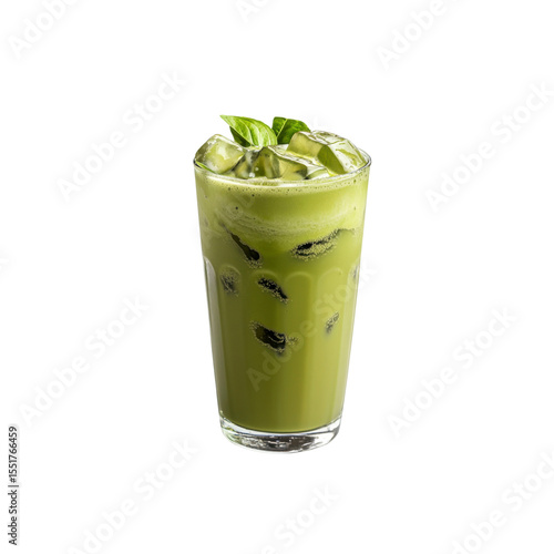 matcha, latte, green tea, iced tea, basil, garnish, beverage, drink, cocktail, ice, ice cube, glasses, vibrant, delicious, tasty, cafes, eatery, menu, food photography, studio shot, isolated, transparency, background