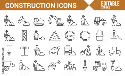 Icon Set for Construction Vehicles, Safety Signs, and Equipment at Construction Sites