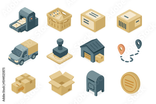 icon, set, delivery, shipping, element, package, box, mail, stamp, warehouse, route, truck, parcel, logistic, cargo, transportation, supply, service, postal, open, closed, address, symbol, express, handle, order, online, distribution, system, e-business, post, courier