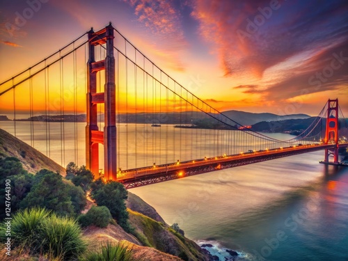 Iconic Golden Gate Bridge twilight, vintage photograph, San Francisco sunset.