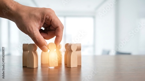 selection, talent, recruitment, human resources, hr, leadership, choice, unique, standout, potential, opportunity, growth, success, excellence, career, employee, candidate, individual, team, group, best, special, finding, searching, identifying, management, strategy, business, concept, idea, metaphor, symbolic, abstract, hand, wooden, figure, person, figurine, table, desk, glowing, light, bright, shining, office, indoor, blur, bokeh, workspace
