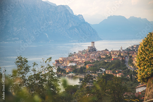Idyllic coastline in Italy: Blue water and a cute village at lago di garda, Malcesine, sunset