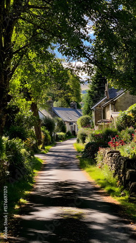 Idyllic Country Road Winding Through a Lush Green Village Landscape