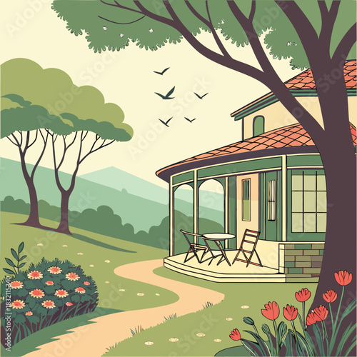 house, home, countryside, rural, garden, flower, tulip, tree, nature, landscape, lawn, grass, path, paseo, porch, patio, table, chair, seating, bird, sky, hill, mountain, scenic, peaceful, tranquil, serene, illustration, drawing, art, design, vintage, retro, spring, summer, daytime, exterior, architecture, bungalow, villa