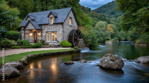 Idyllic stone cottage with glowing windows and a wooden waterwheel nestled by a calm river in lush green hills, perfect for travel, countryside living, and storybook illustration concepts.