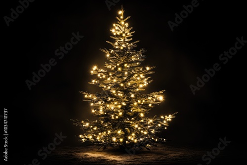 christmas, tree, night, dark, light, illuminated, festive, holiday, season, december, winter, snow, white, ground, tree branch, green, yellow, glow, sparkle, twinkle, celebration, joy, magic, miracle, spirit, tradition, peace, hope, love, gift, ornament, star, cold, frosty, pine, spruce, coniferous, fir