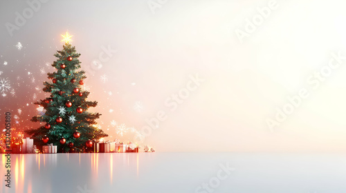 Illuminated Christmas Tree With Red And Gold Ornaments And Gifts On A White Background With Sparkling Snowflakes