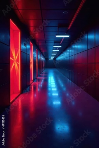 futuristic, corridor, hallway, neon, light, red, blue, illumination, glow, shiny, polished, floor, modern, architecture, interior, design, abstract, vibrant, colours, dark, mysterious, sleek