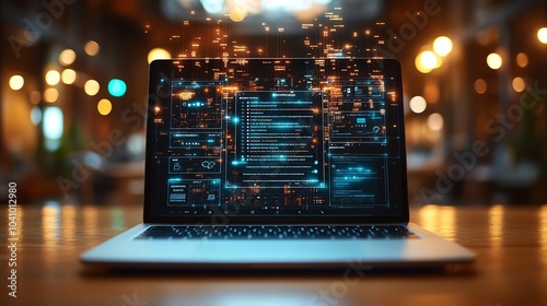 Illuminated laptop with digital data visualization on screen in a cozy setting.