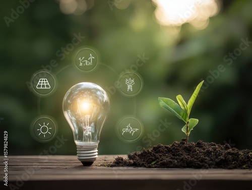 Illuminated lightbulb surrounded by eco-icons, next to a seedling