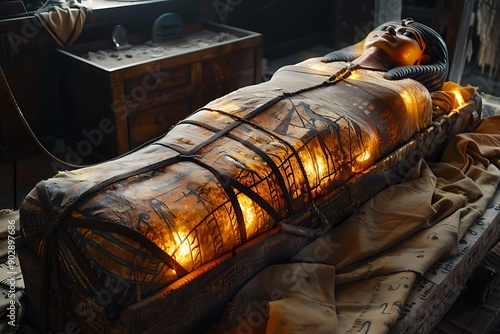 Illuminated Mummy in a Sarcophagus in a Museum Setting.