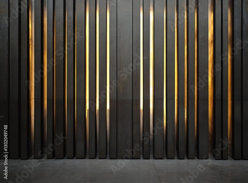 wall, metal, slat, vertical, illuminated, light, gold, bronze, dark, texture, background, design, architecture, modern, interior, pattern, abstract, line, stripes, geometric, industrial, contemporary, style, elegant, luxury, room, space, surface, panel, element, structure, aesthetic, glossy, shadow, shine, gleam, glow, ambient, concrete, floor