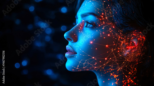 Illuminated Woman Side Profile with Glowing Neon Network Nodes Against Dark Background, Artifical Intelligence and Technology Concept