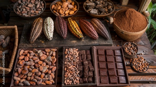 Illustrate a variety of chocolate bars arranged in a rustic setting, with raw cocoa beans and pods as part of the display.