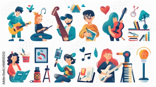 Illustrate vector icons for various hobbies and interests, like music, painting, reading, and gardening, with creative and engaging elements