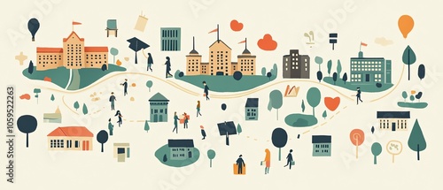 illustration, city, landscape, urban, town, building, architecture, people, walking, park, tree, nature, street, road, path, map, community, design, graphic, flat, vector, digital, art, style, cartoon, drawing, modern, abstract, background, texture, pattern, green, colours, white, blue, red, yellow, minimal, business, education, school, university, college, campus, student, graduation, career, growth, future