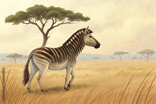 illustrated scene of quagga, half-striped zebra, standing in African plain