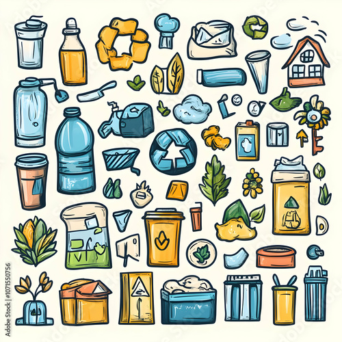 ecology, eco, illustration, global warming, pollution, reuse, biodegradable, environmentally friendly, doodle, earth, green, planet, waste management, preserving, protect, nature, glasses, paper, sustainability, plastic, metal, trash, tri sélectif, compost, cartoon, reusing, waste disposal, environment, environmental protection, bin, climate change, garbage, container, bottle, organic, can, bag, recycling, reduce