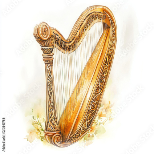 illustration, painted, style, harp, watercolor, musical, instrument, stringed, music, art, artistic, culture, traditional, classic, drawing, design, vintage, retro, elegant, craft, hand-made, detail, pattern, texture, ornate, decoration, decorative, folk, nobody, white, background, isolated, skill, melody, performance, sound, wood, wooden, gold, carved, classical, celtic, irish, string, detailed, ethnic, light