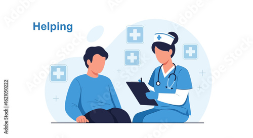 Illustration depicting a nurse helping a patient with healthcare assistance and medical support