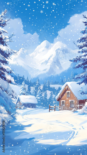 Illustration depicts an outdoor scene of snow-covered mountains, pine trees, and wooden houses in winter.