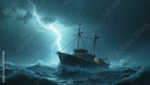Illustration fishing boat battling severe storm at sea. Lightning strikes illuminate dark sky, turbulent ocean. Vessel faces danger, waves crash. Concept art of adventure, risk, lone ship, high