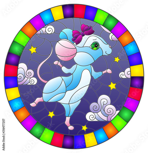 Illustration in stained glass style with a dancing mouse on the background of the starry sky and clouds, oval image in bright frame