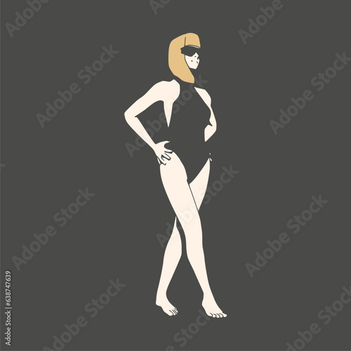 Illustration of a beautiful fashion model posing in a stylish swimsuit wearing sunglasses. Young attractive woman in beachwear.