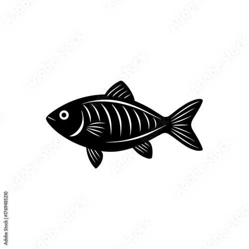 Illustration of a black fish skeleton with fins and tail on a white background on transparent background