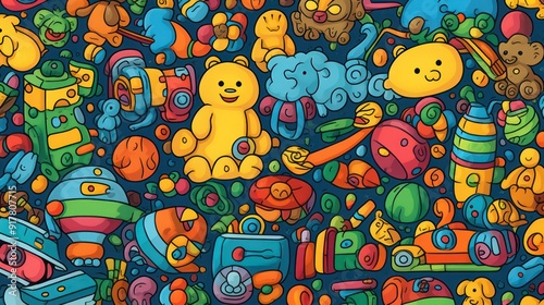 Illustration of a cat pattern, with a background of colorful children's toy balloons.
