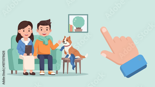 couple, man, woman, dog, pet, sitting, couch, sofa, pointing, hand, cursor, illustration, vector, graphic, happy, smiling, cheerful, home, room, indoor, relaxed, casual attire, friendly, companion, domestic, animal, plant, frame, wall, tablet, device, technology, lifestyle, people, male, female, brown, green, blue, orange, white, simple, flat, interaction, relaxation, communication, background, comfort