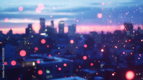 Illustration of a financial district skyline at dusk, with glowing holographic stock market graphs and data overlays floating in mid-air, high contrast lighting