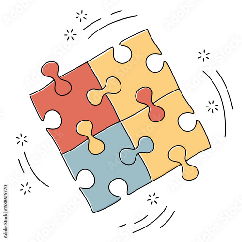 Illustration of a four piece jigsaw puzzle with red yellow and blue colors and sparkle effects around it