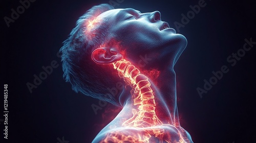 x-ray, pain, spine, bone, joint, chronic, treatment, illuminated, light, glowing, body, human, silhouette, dark background, futuristic, technology, neon, fiber-optic, artistic, creative, conceptual, back, shoulder, neck, closeup, half face, curly hair, moody, contrast, modern art, innovation, digital artwork, science fiction, energy, electricity, abstract, luminescence, intricate