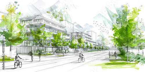 modern, urban, street, bicyclist, architecture, illustration, city, sustainable, vibrant, contemporary, building, tree, greenery, environmentally friendly, sidewalk, bicycle, pedestrian, landscape, environment, infrastructure, clean energy, park, community, transportation, drawing, vignetting, lifestyle, healthy living, urban life, city landscape, artistic, residential area, recreation, nature, urban development, streetscape