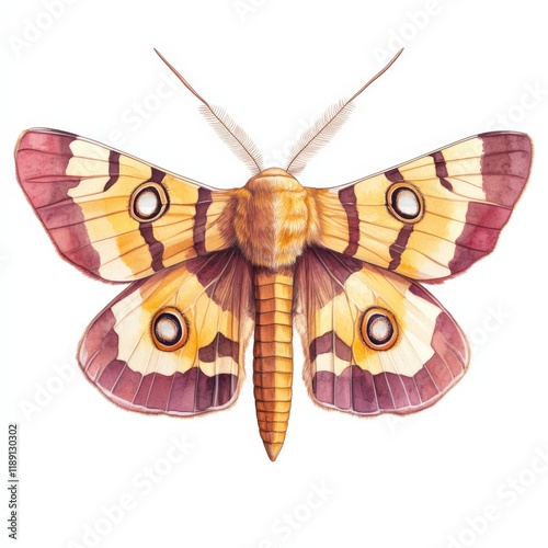 moth, illustration, insect, wing, yellow, purple, art, drawing, nature, animal, pattern, design, white, background, isolated, beautiful, colourful, closeup, detailed, antennae, brown, body, spot, circle, artwork, painted, hand-drawn