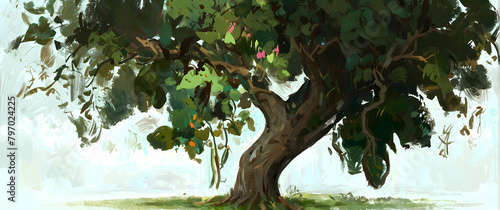 Illustration of a robust tree with dense foliage, possibly an old oak, standing firmly amidst a calm environment evoking a sense of tranquility and longevity