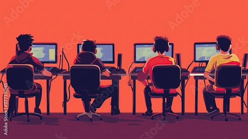 Illustration of a tournament on computer games, players sitting at computers in the game center