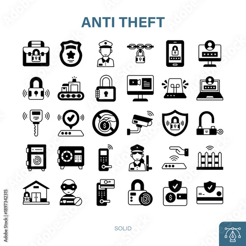 anti-theft, security, set, protection, safety, lock, surveillance, police, guard, glyphs, shield, robber, icon, crime, prevention, collection, data protection, vector, signs, element, web design, solid, style, alarm, camera, chain, credit card, fence, fingerprint, key, laptop, password, safe, technology, thief, billfold, steering wheel, monitor, house, door lock, pack