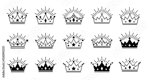 Illustration of fifteen stylized crowns with radiating lines and star accents in black