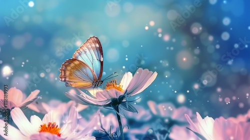 Illustration of open colorful exotic batterfly over flowers