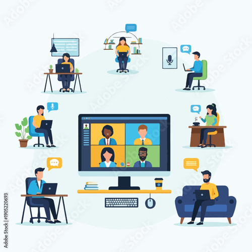 communication, online, technology, video, conference, meeting, call, remote, work, digital, discussion, conversation, connect, screen, laptop, computer, individual, people, diverse, collaboration, teamwork, virtual, chat, dialogue, graphic, illustration, vector, design, modern, flat, style, isolated, background, office, home, furniture, desk, chair, couch, person, woman, man, global, cyberspace, network, business, software