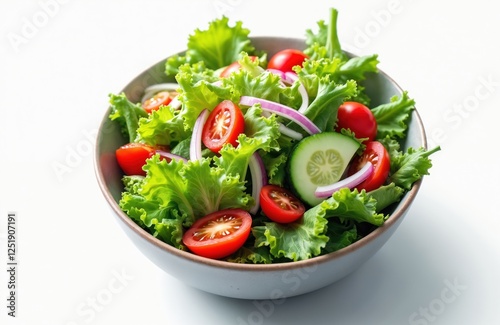 Illustration of vegetable salad in bowl lettuce, tomatoes, cucumbers, onion rings. Fresh healthy vegetarian food for lunch, balanced diet. Food photography, culinary concept, organic ingredients.