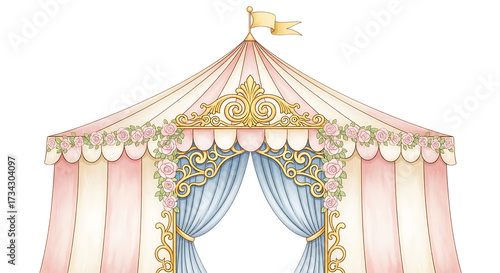 Illustration of vintage circus tent with pink and white stripes, ornate gold trim, and floral decorations, isolated on transparent background