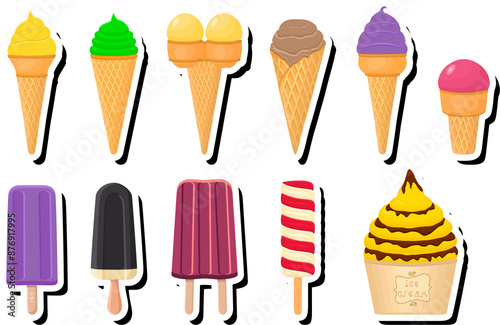 ice, cream, ice cream, gelato, graphic, sticker, food, sweet, dessert, cone, popsicle, sorbet, double, ball, waffle, summer, stick, bucket, scoop, eskimo, sherbet, sundae, fruity, chocolate, isolated, set, collection, lemon, vanilla, coconut, hot drink, black, pistachio, grape, plum, blackberry, fig, raspberry, label, logotype, magnet, icon, patch, illustration, background, emblem, cold, piece